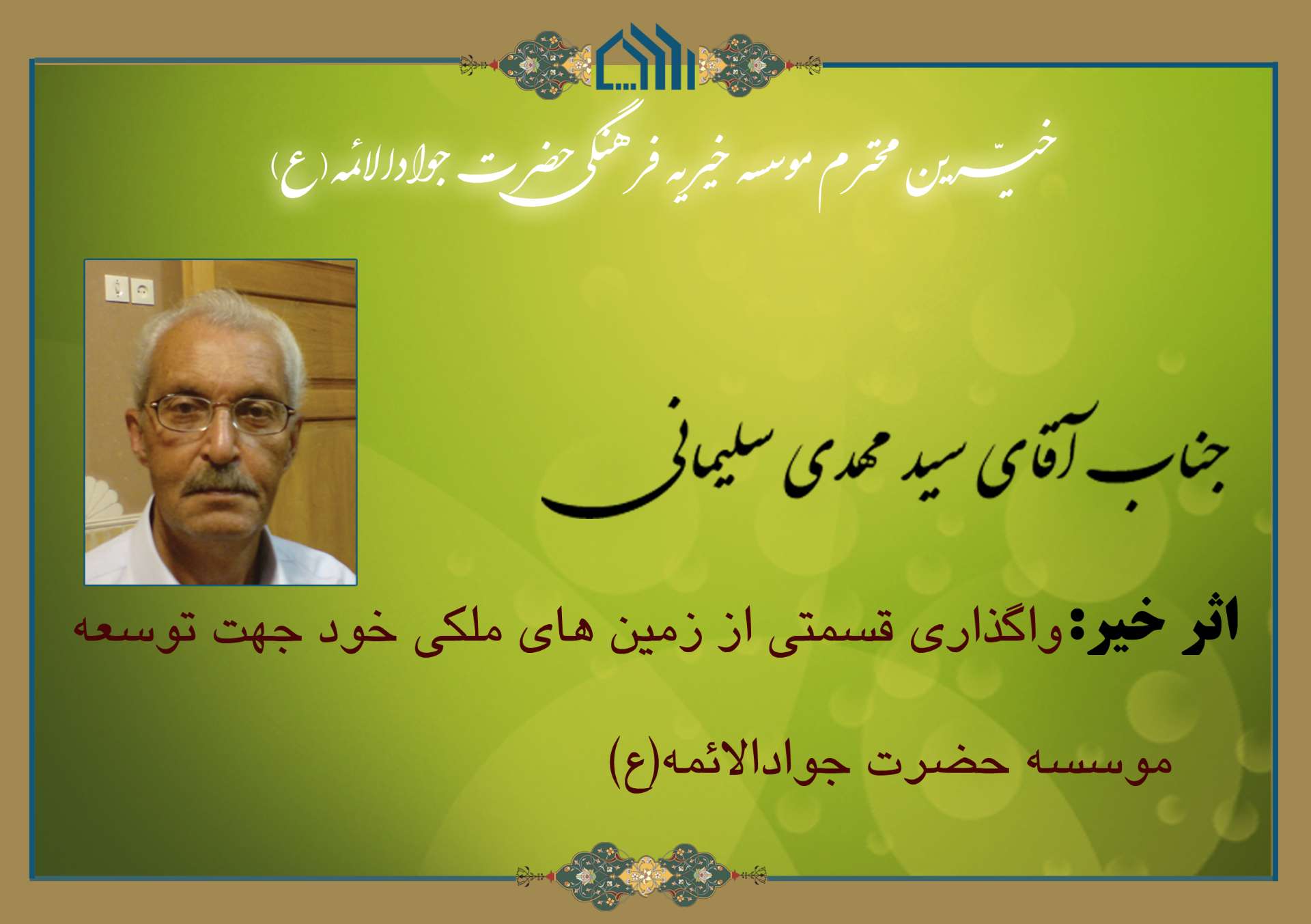 - جناب آقای سید مهدی سلیمانی: واگذاری قسمتی از زمینهای ملکی خودو تامین بخشی از هزینه ساختمان دبستان دوره دوم احمد اقا سلیمانی