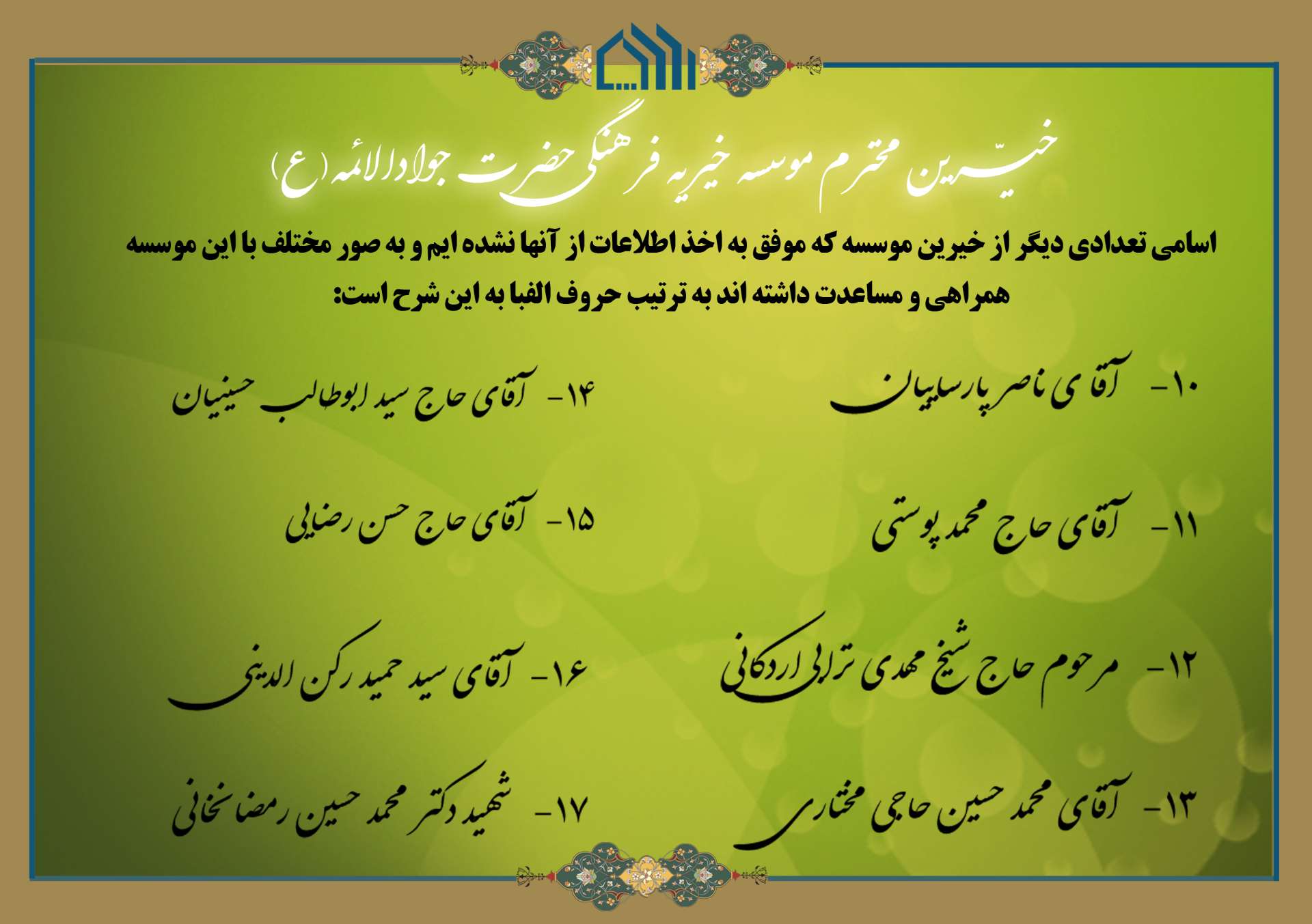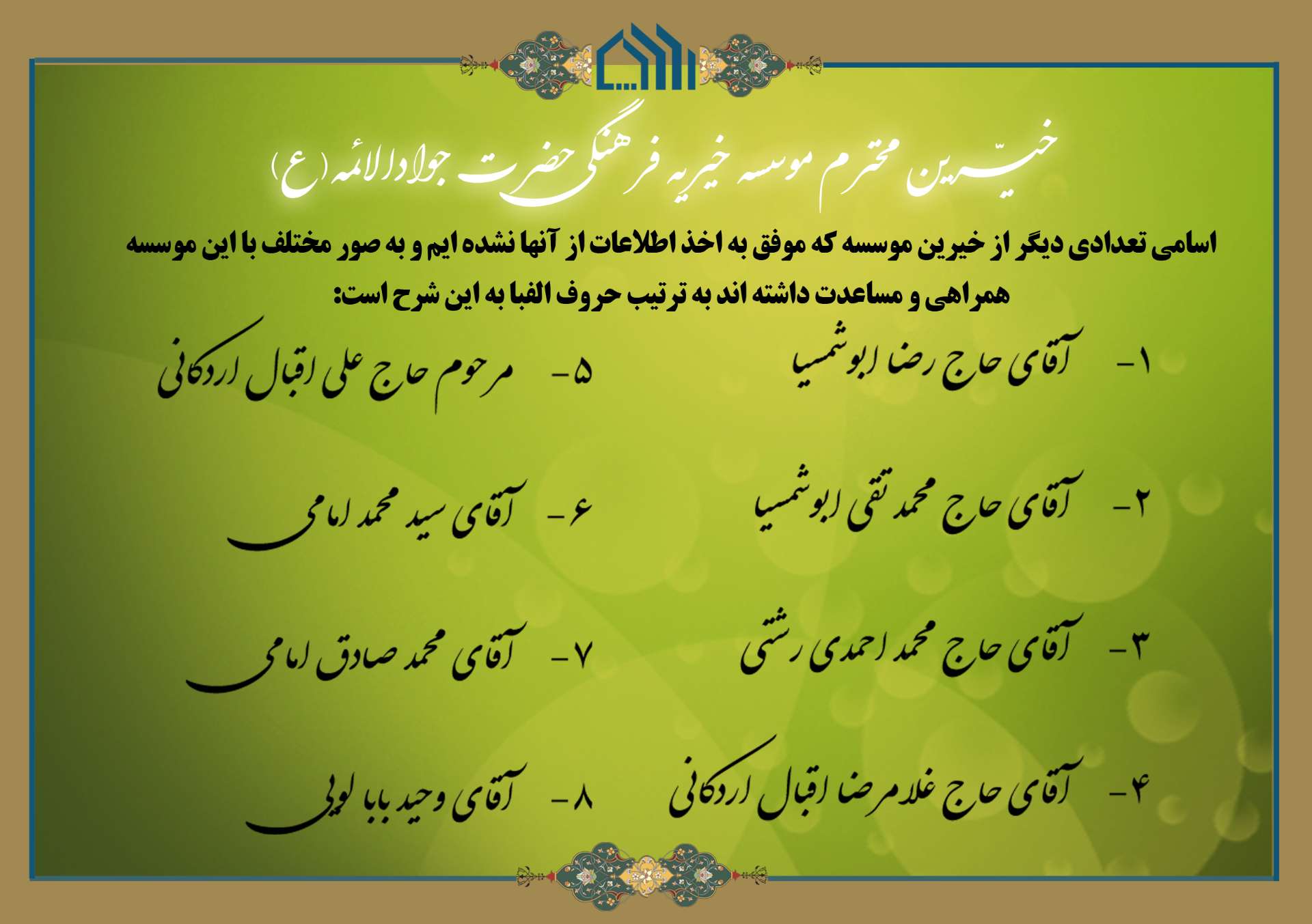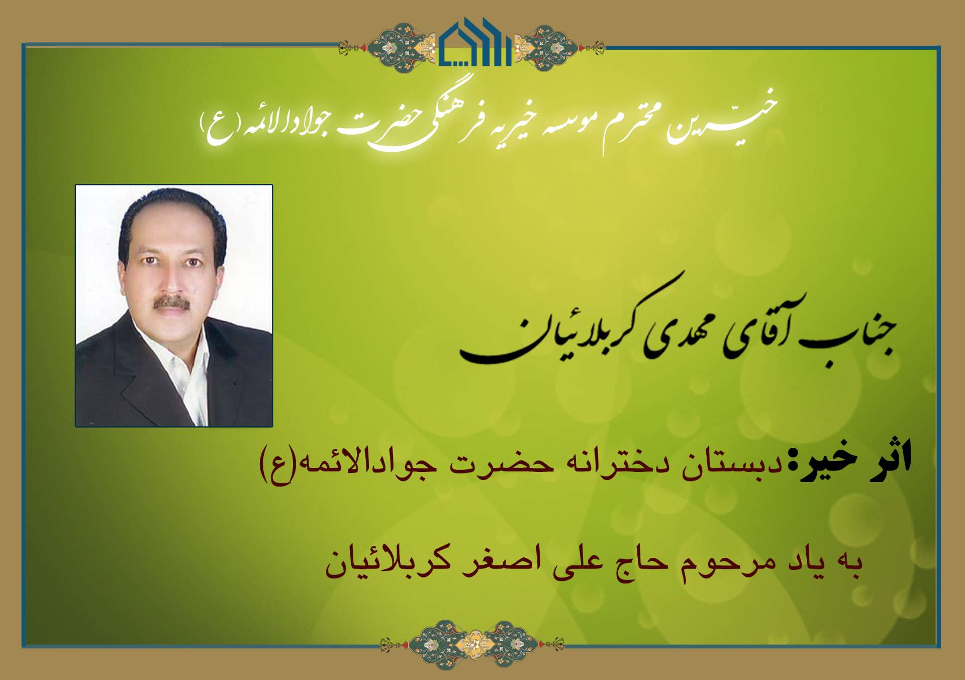 - جناب آقای مهدی کربلاییان : تامین قسمتی از هزینه ساخت دبستان دخترانه حضرت جوادالائمه