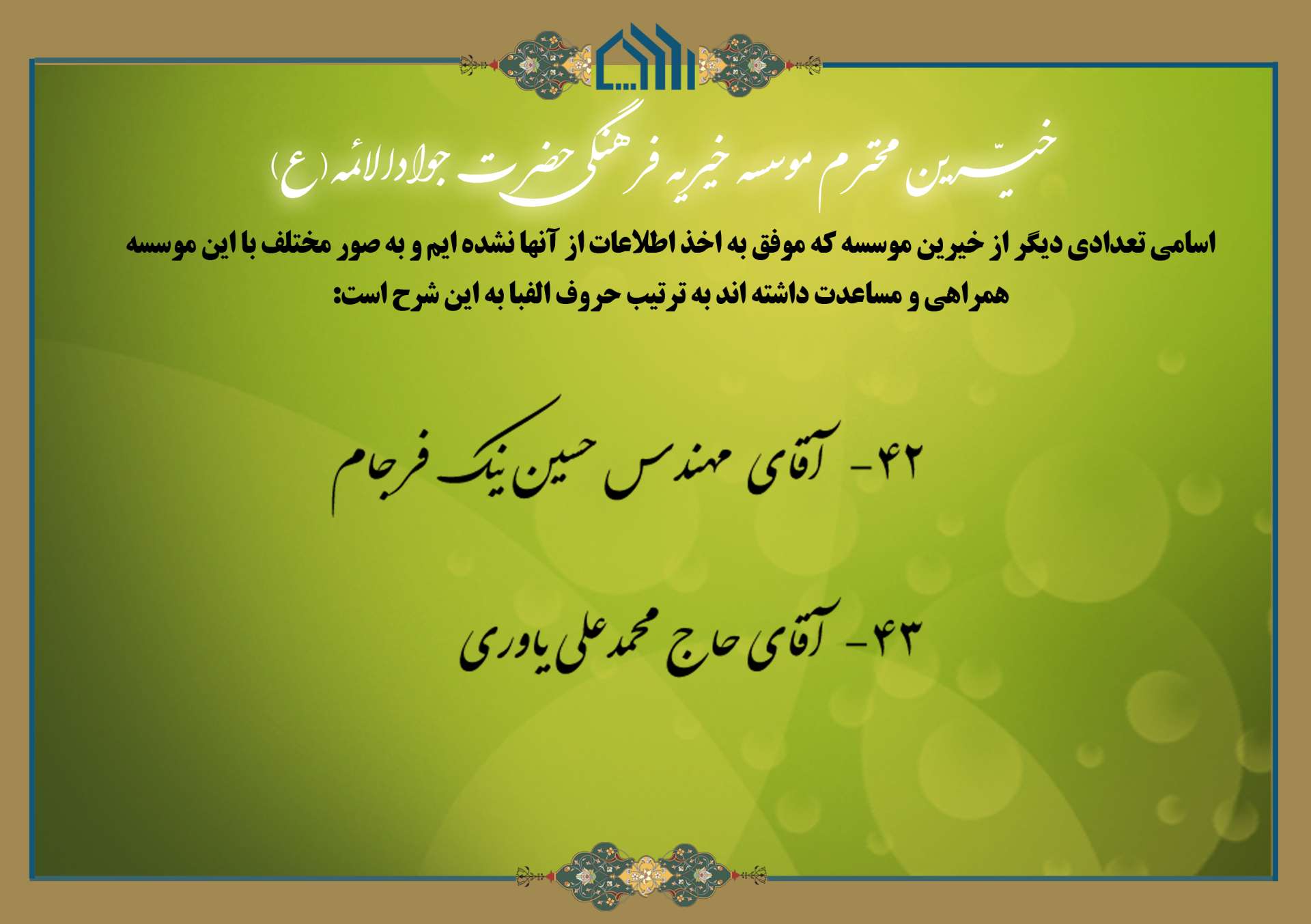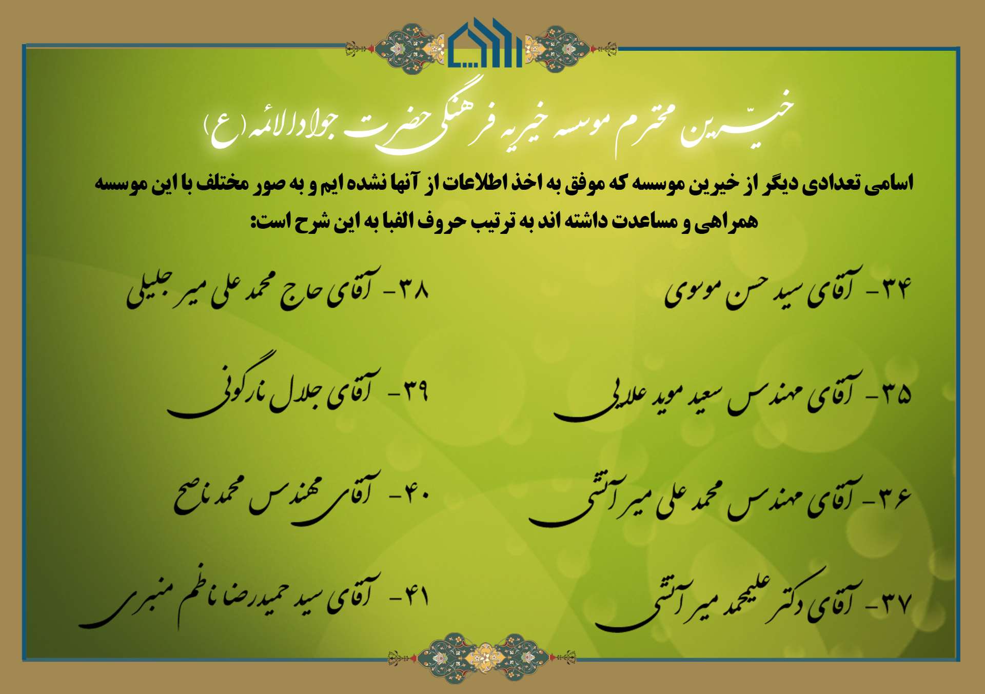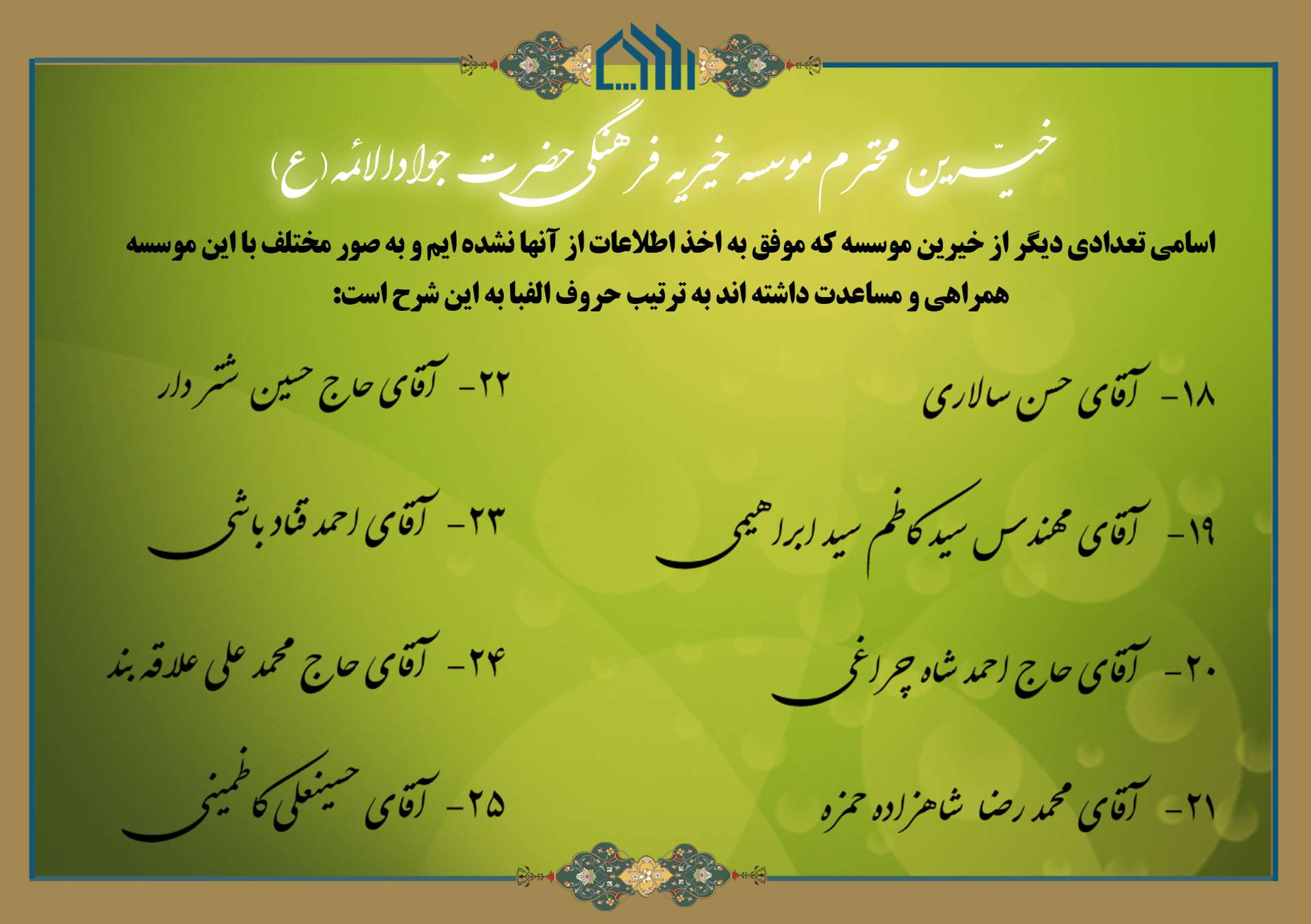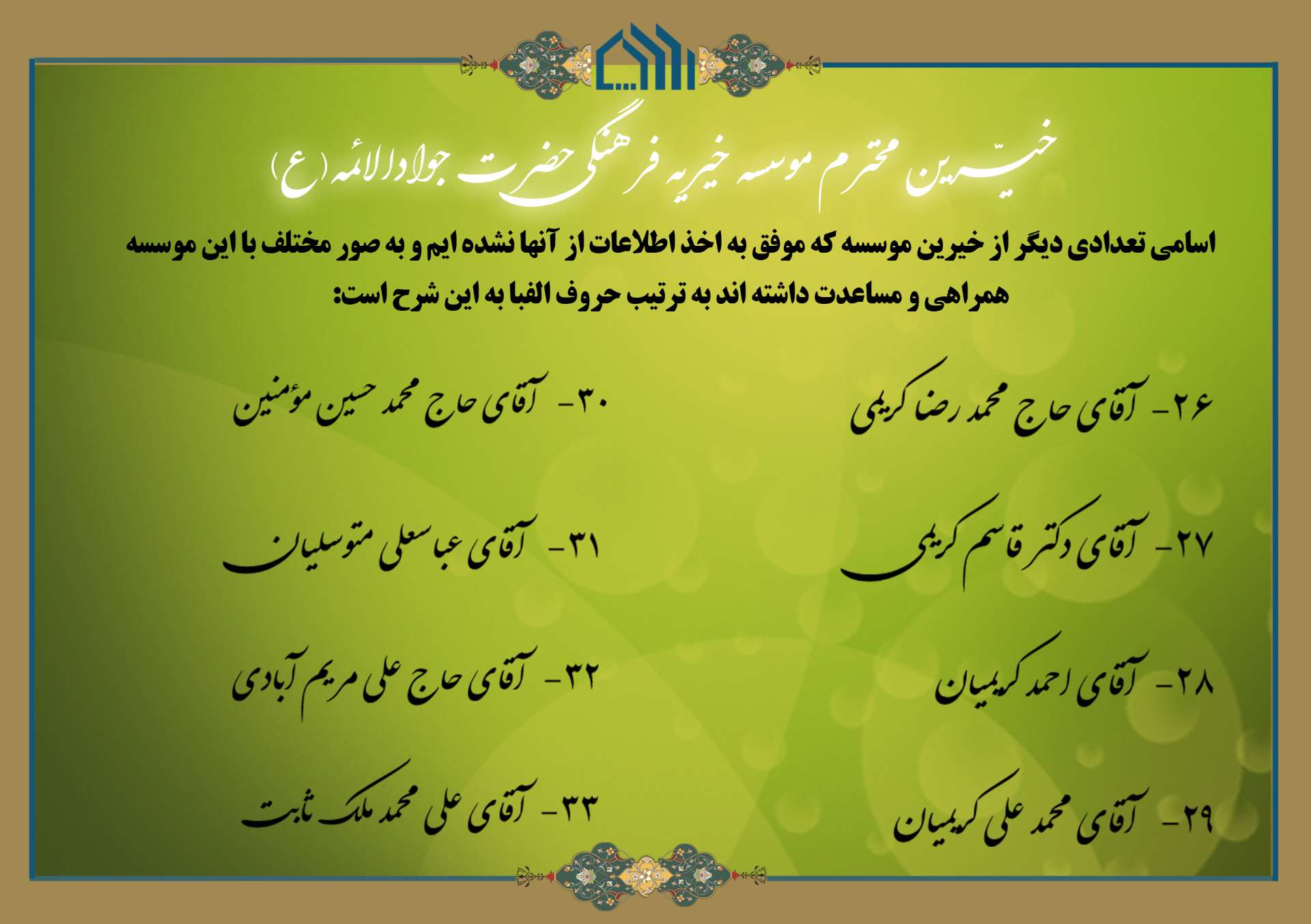 - جناب آقای مهدی کربلاییان : تامین قسمتی از هزینه ساخت دبستان دخترانه حضرت جوادالائمه