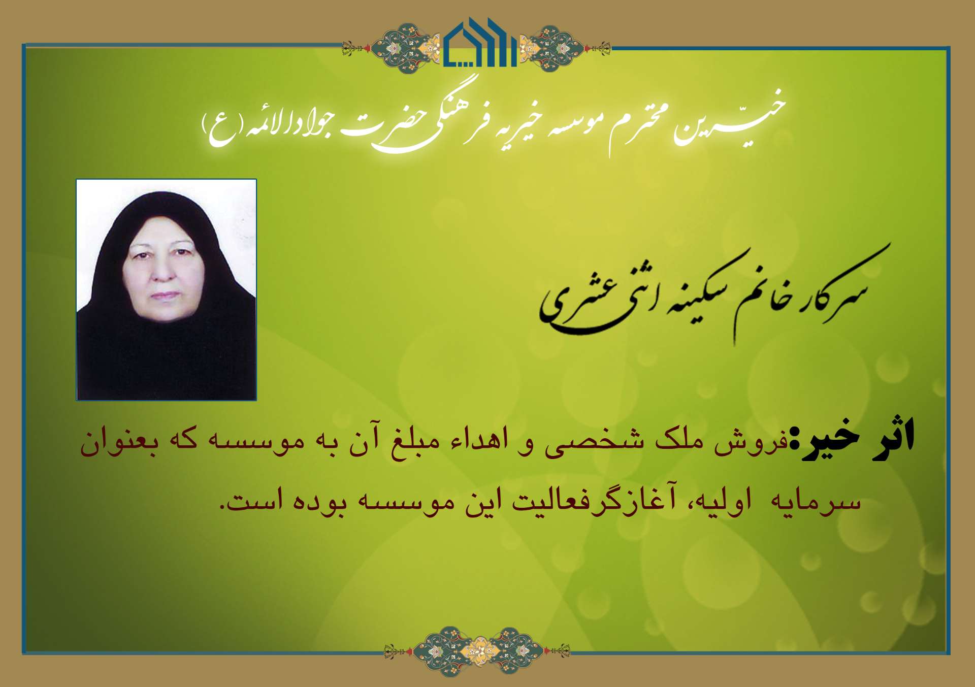 - سرکارخانم سکینه اثنی عشری : اهدای سرمایه اولیه و تامین هزینه بخشی از ساختمان دبستان پسرانه دوره دوم(احمداقا سلیمانی)
