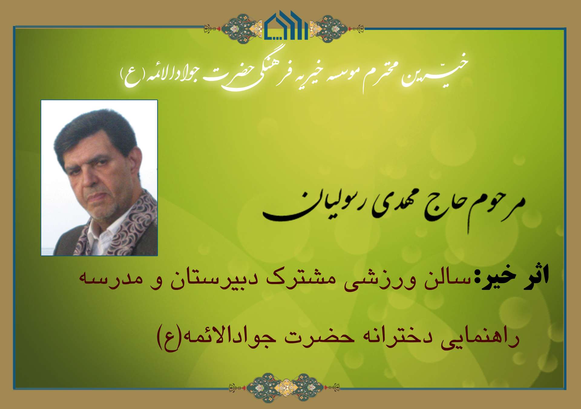 - مرحوم حاج مهدی رسولیان: سالن ورزشی مشترک دبیرستان و مدرسه راهنمایی دخترانه حضرت جوادالائمه (ع)