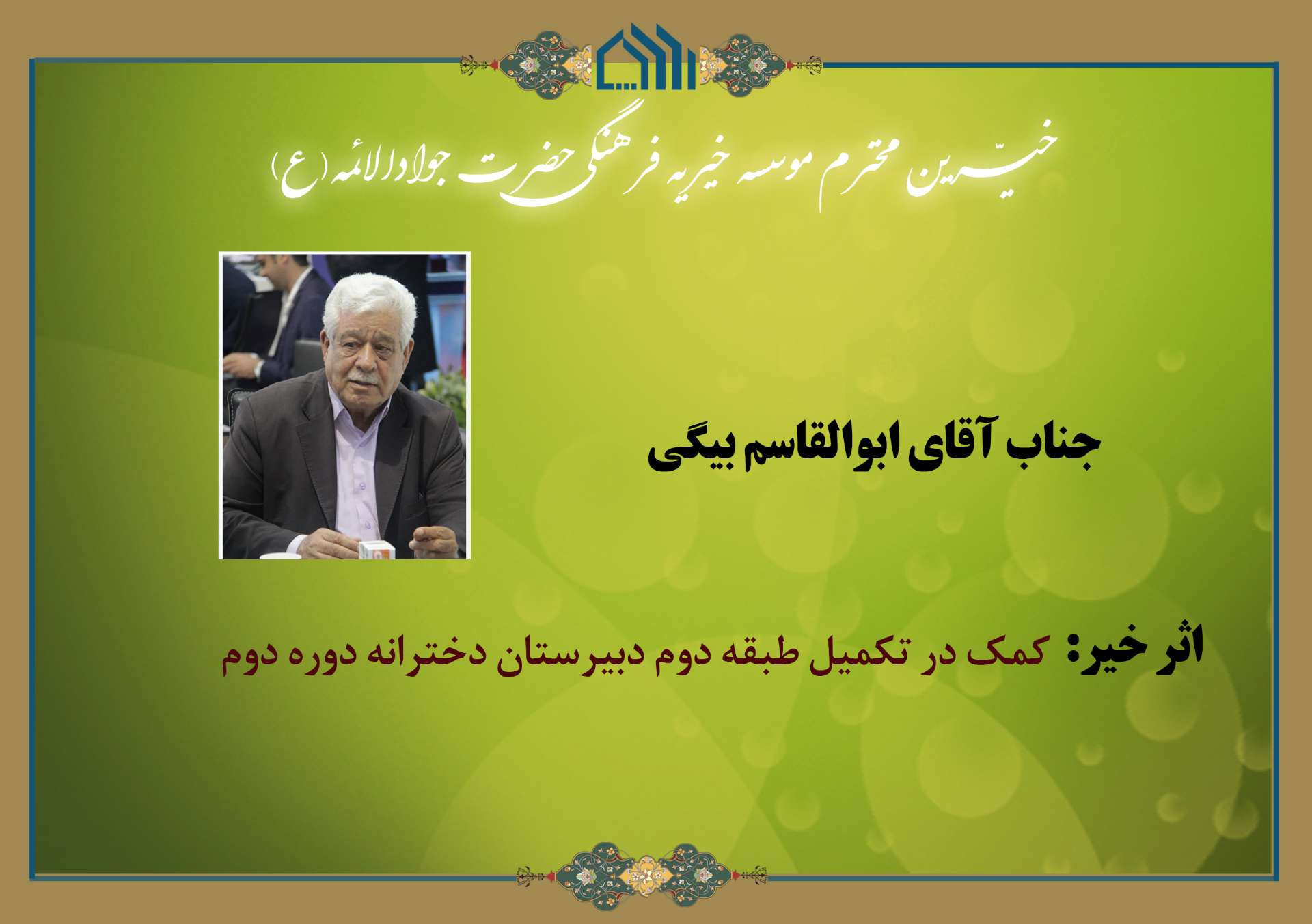 - جناب آقای ابوالقاسم بیگی: کمک در تکمیل طبقه دوم دبیرستان دخترانه دوره دوم