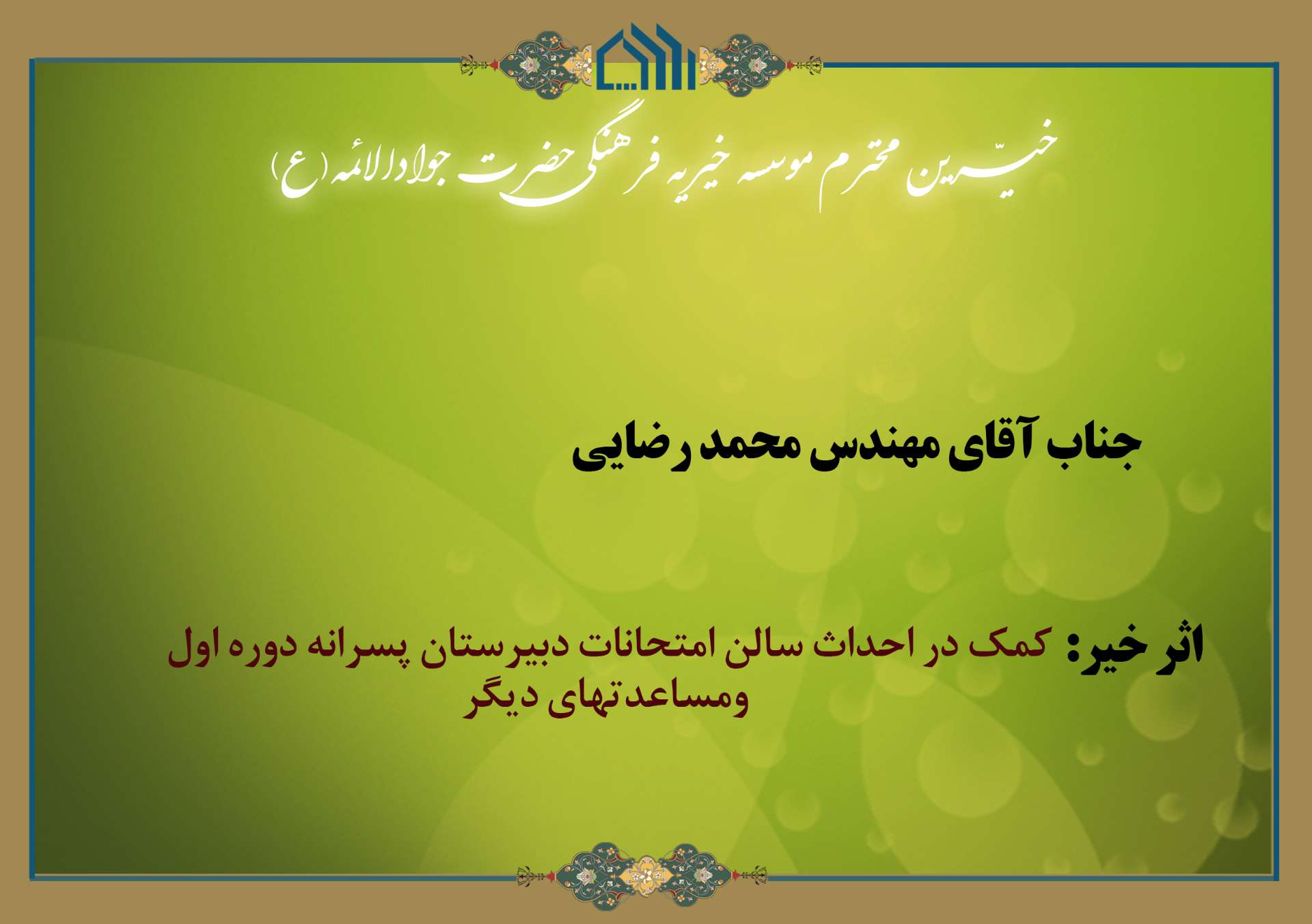 - جناب آقای مهندس محمد رضایی : کمک در احداث سالن امتحانات دبیرستان پسرانه دوره اول و مساعدت های دیگر
