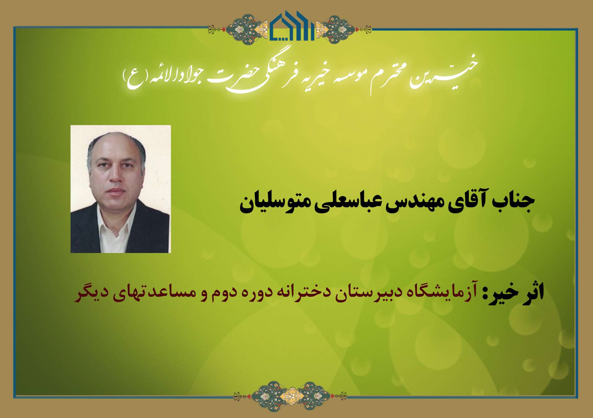 - جناب آقای مهندس عباسعلی متوسلیان: آزمایشگاه دبیرستان دخترانه دوره دوم و مساعدت های دیگر