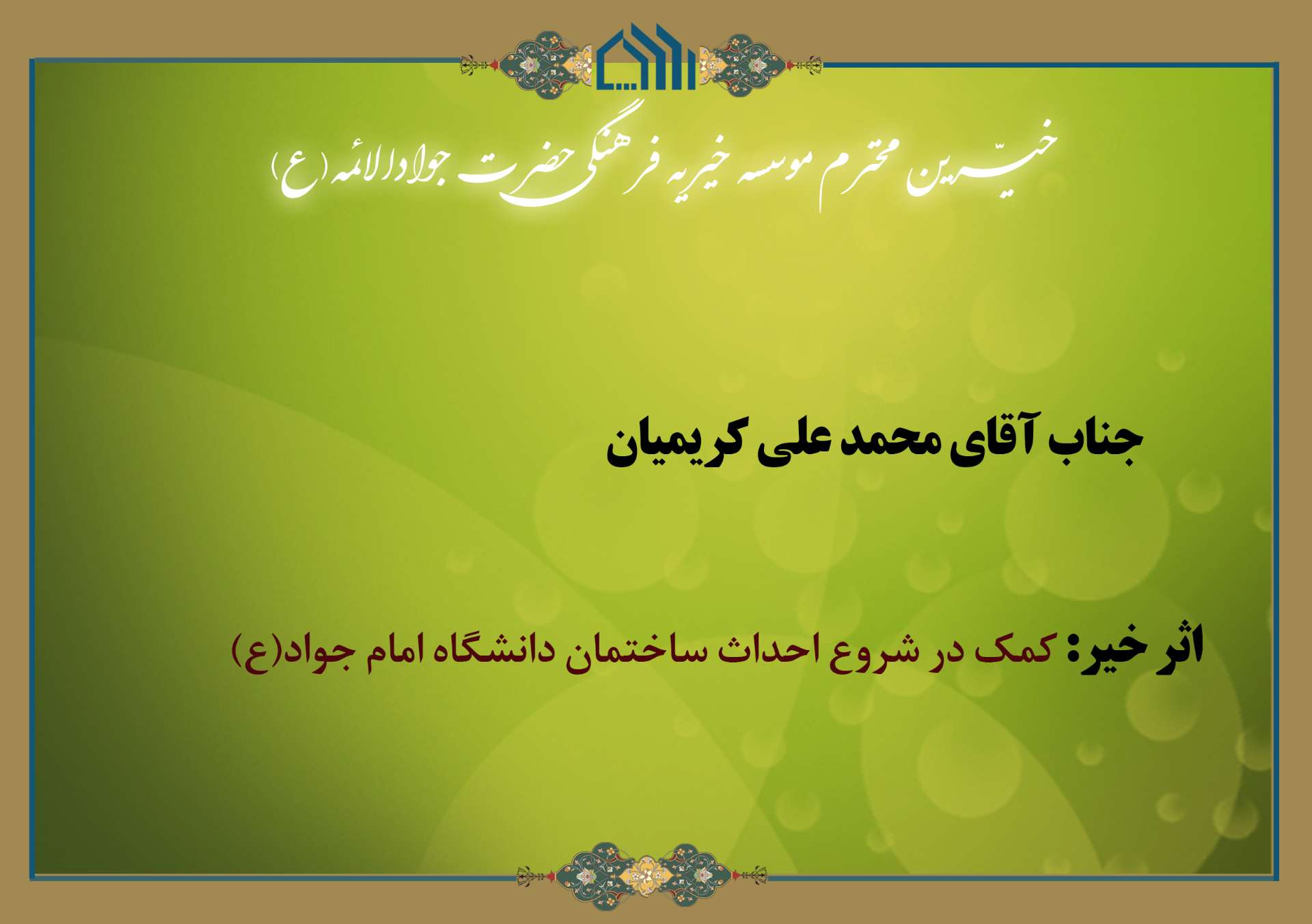 - جناب آقای محمدعلی کریمیان: کمک در شروع احداث ساختمان دانشگاه امام جواد (ع)