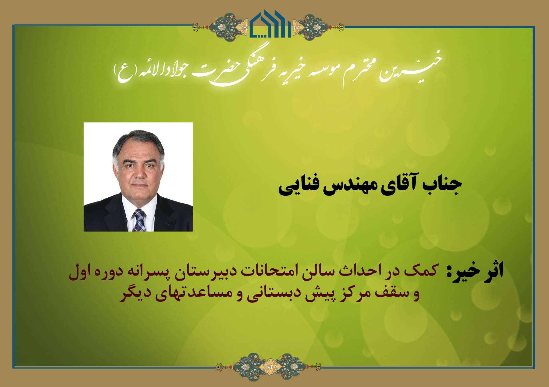 - جناب آقای مهندس محمدمهدی فنایی: کمک در احداث سالن امتحانات دبیرستان پسرانه دوره اول و سقف مرکز پیش دبستانی و مساعدت های دیگر