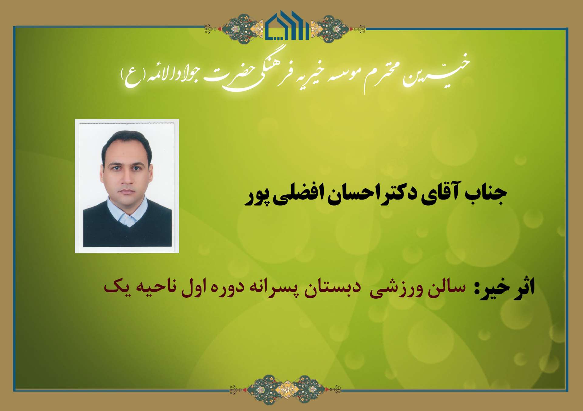 - جناب آقای دکتر احسان افضلی پور: سالن ورزشی دبستان پسرانه دوره اول ناحیه یک