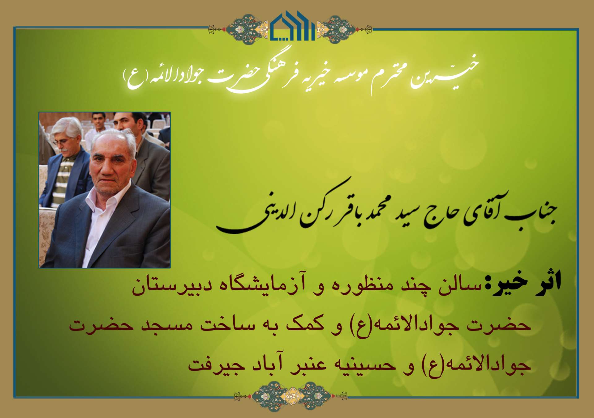 - جناب آقای حاج سید محمد باقر رکن الدینی: ساخت سالن چندمنظوره، آزمایشگاه دبیرستان حضرت جوادالائمه، مسجد حضرت جوادالائمه و حسینیه عنبرآباد جیرفت