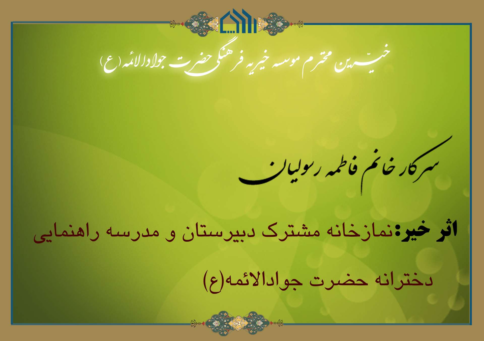 - سرکارخانم فاطمه رسولیان: ساخت نمازخانه مشترک دبیرستان های دوره اول و دوم دخترانه حضرت جوادالائمه