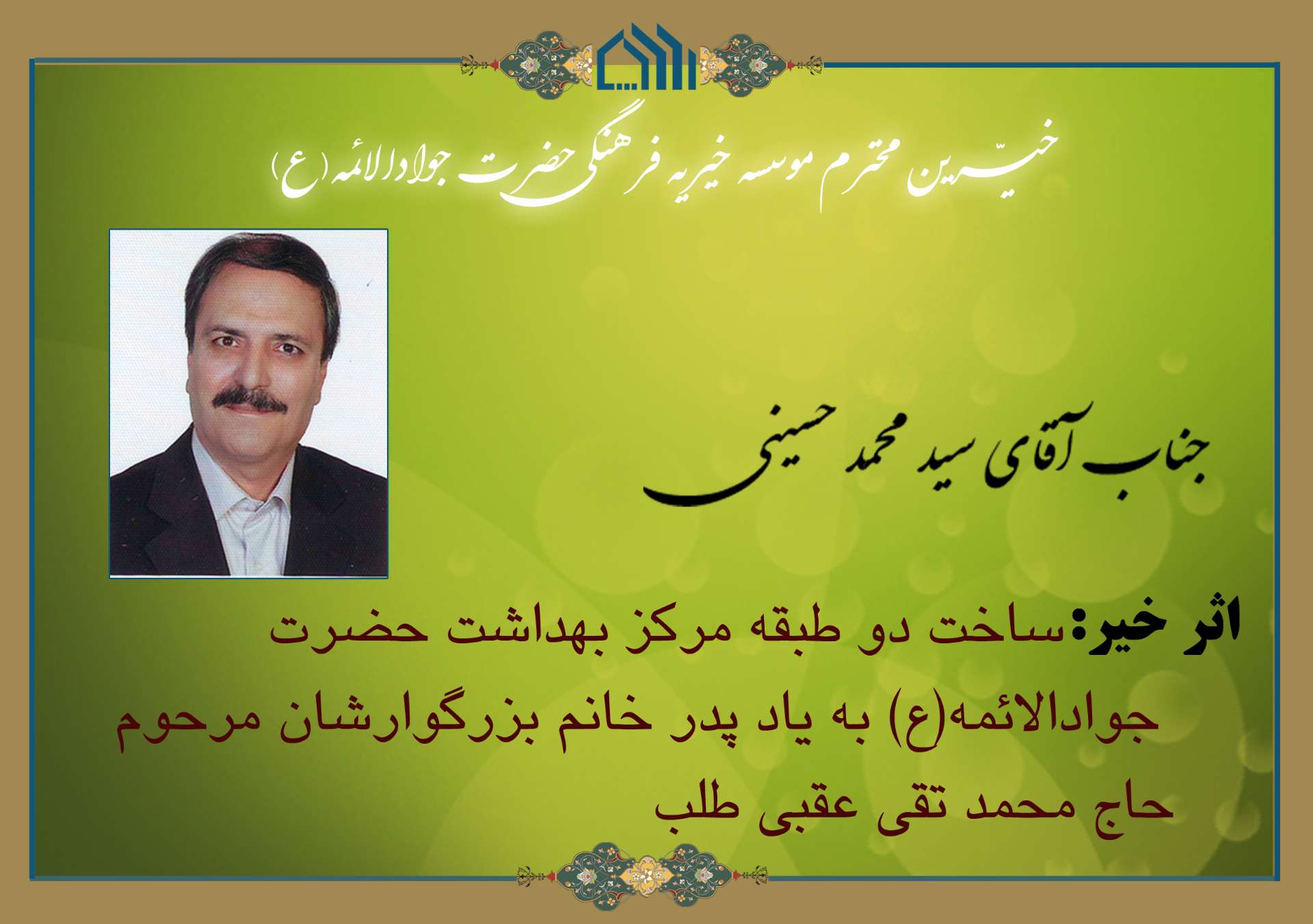 - جناب آقای سید محمد حسینی: ساختمان دوطبقه مرکز بهداشت حضرت جوادالائمه