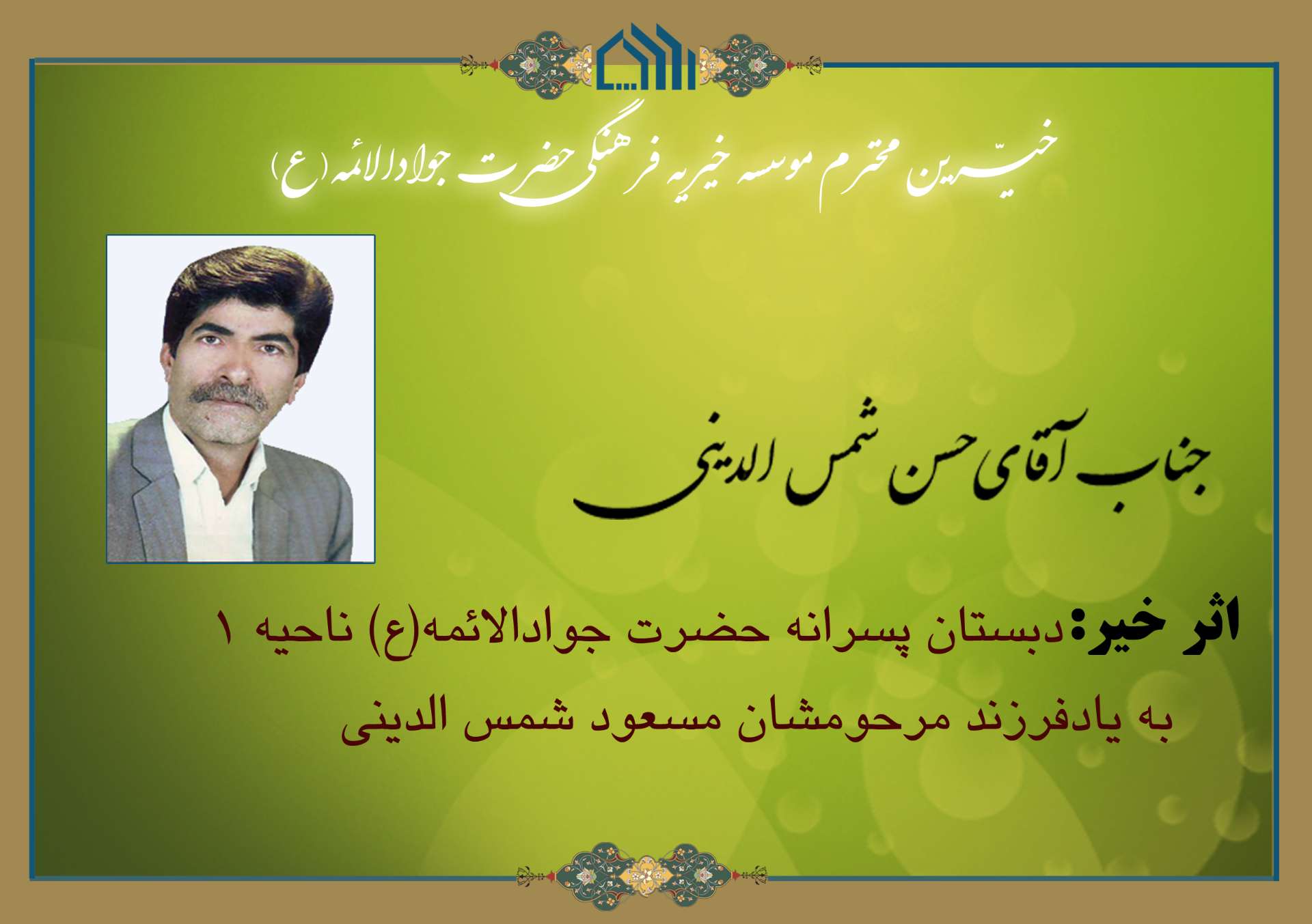 - جناب آقای حسن شمس الدینی:ساخت دبستان پسرانه حضرت جوادالائمه ناحیه یک واقع در امام شهر به یاد فرزند مرحومشان